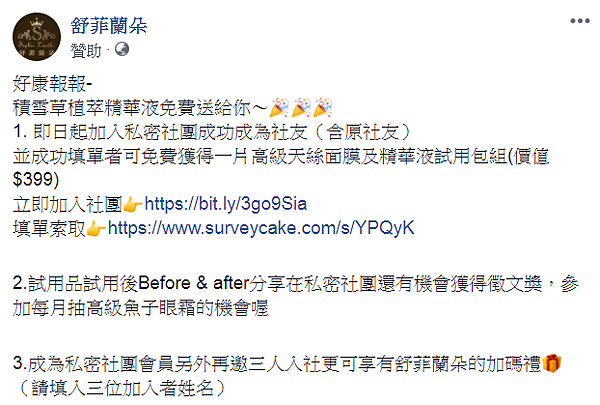 25. 加入社團並填單者免費獲得一片高級天絲面膜及精華液試用包組。