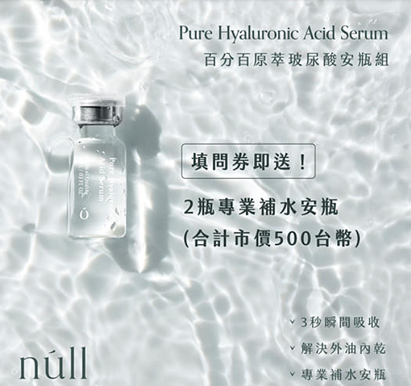 38. 填寫保養使用習慣問卷,即贈Núll 諾爾百分百原萃玻尿酸安瓶(兩瓶)。