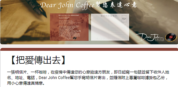 Dear John Coffee幫您手寫明信片寄出,並隨信附上專屬咖啡濾掛包乙份。