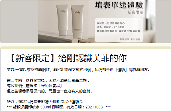 50. 填寫完表單,免費索取體驗品(芙菲舒顏深層卸妝水 300ml 即期品),