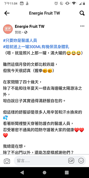 56. 醫護人員私訊Energie Fruit TW相關證件,免費索取有機保濕身體乳300ml。