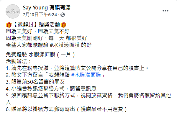 免費索取Say Young 有膜有漾水膜漾面膜一片。