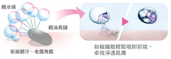 告別傳統卸妝時過度拉扯肌膚所造成的傷害,透過磁性導出卸妝因子的親油、親水端長鏈的構造,