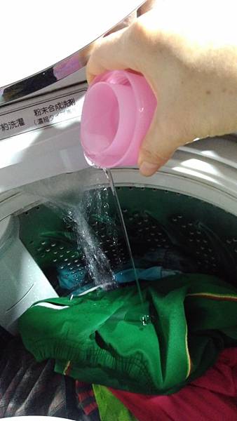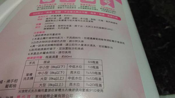 實際使用時,因為我家是單槽大型洗衣機,用的是高水位,所以要加1又2/3瓶蓋~
