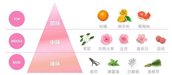 最後佐以廣藿香、白麝香等沉穩優雅的木質香調中和清甜花果香,