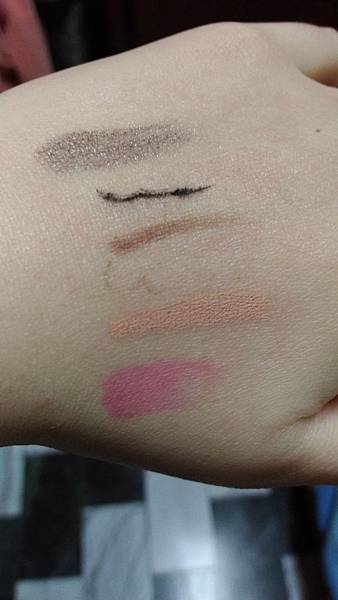 接著我在手上畫了各種彩妝,分別是眼影、眼線、眉粉、底妝、唇膏。