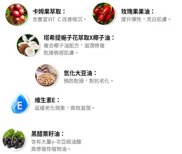 其中添加六大滋潤成分,獨特添加夜間專屬唇部護理的成分卡姆果,