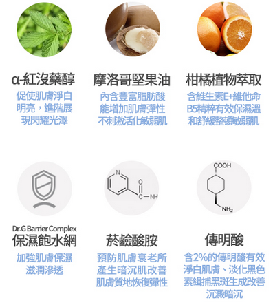 Dr.G α-紅沒藥淨白系列三重亮白阻黑因子舒緩淨白、剋黑打光、高機能阻黑,