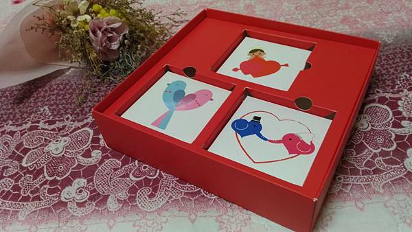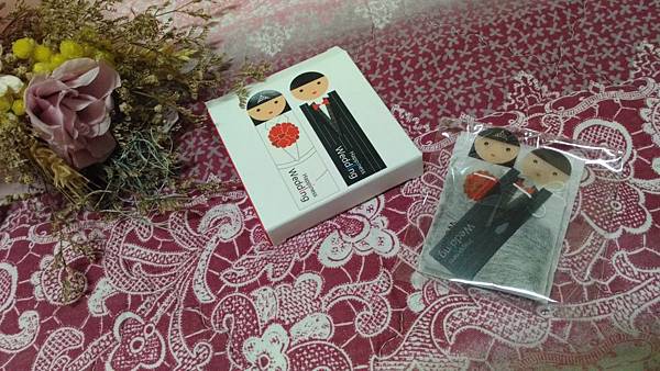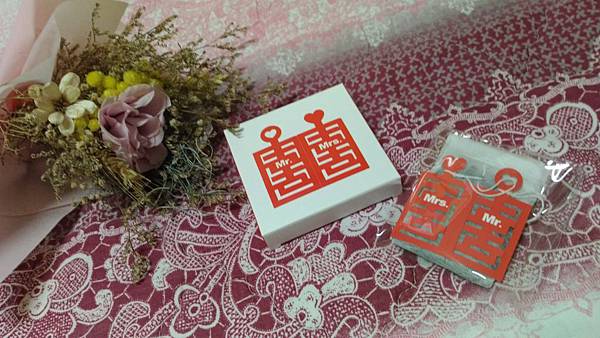 永結同心組是以愛心的樣式呈現,愛心上的Q版新人拿著捧花,