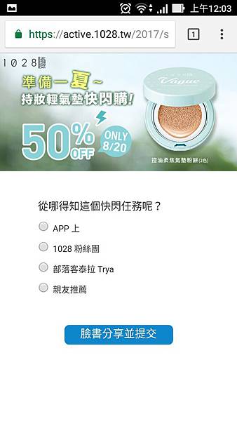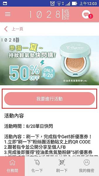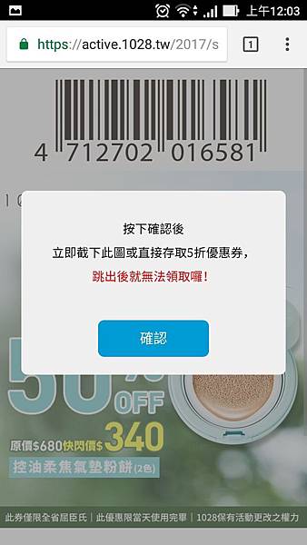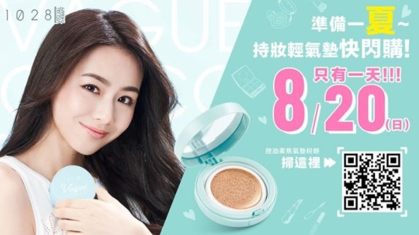 最後可以獲得1028控油柔焦氣墊粉餅半價折價券,限8/20當天使用,