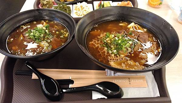 兩碗牛肉麵加上兩盤炸物、四盤小菜、兩瓶飲料六百元有找,