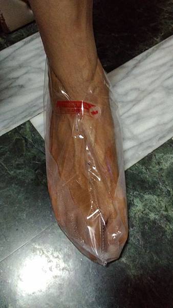 接著剪開足膜,套上之後用貼紙固定,接著等待60-90分鐘後用清水洗淨,
