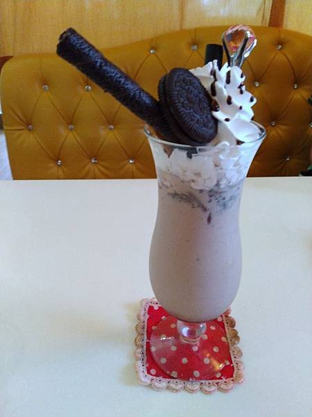 OREO脆片香草那堤上方是一塊OREO、一根脆笛酥和奶油,