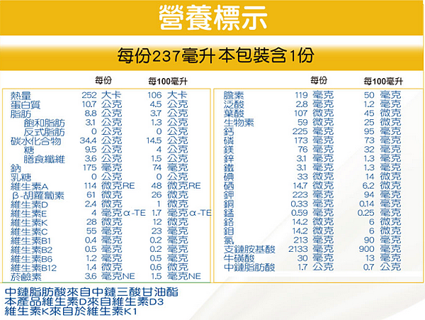 紅牛愛基均衡含纖配方營養素的營養標示如下: