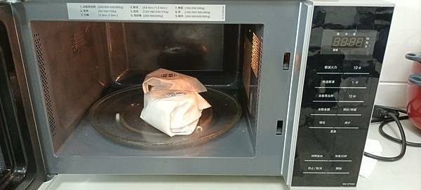 連同白色微波袋一同放於微波爐中,700W微波2分鐘即可。