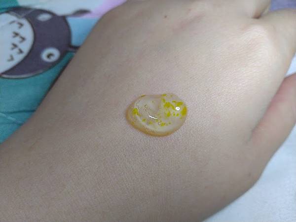 黃金胜肽花蜜賦活霜是淡黃色乳霜狀質地,內含許多橘色的晶球。