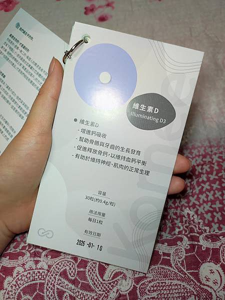 客製化的說明小卡簡介了該營養素的功能、容量、用法用量和有效日期。