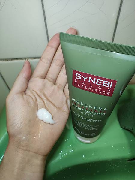 再把SYNEBI森比護色髮膜塗抹在擦乾後的頭髮上,並以按摩導入。