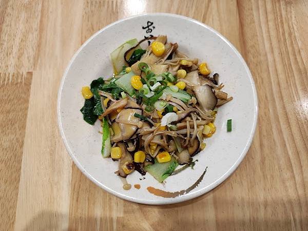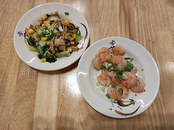 另外還點了小菜黃金泡菜、和風海帶芽、辣蘿蔔、辣炒蝦仁、奶油菇菇跟干貝。