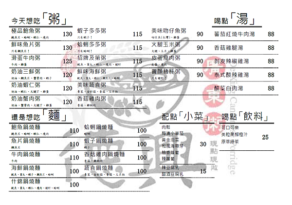 德興廣東粥的粥和鍋燒意麵口味眾多,還有乾麵、湯、小菜跟飲料,