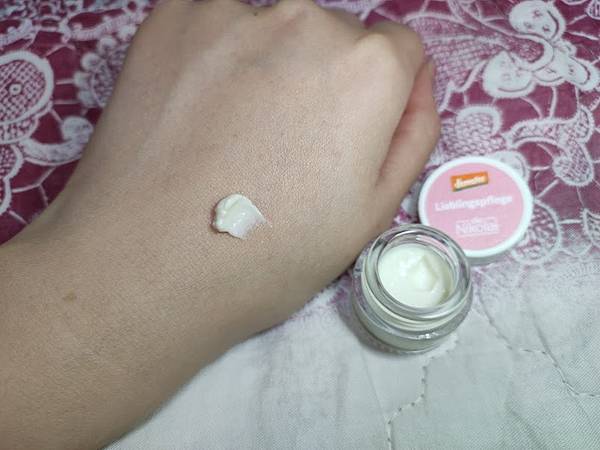 Darling乳霜是白色霜狀質地,用挖勺挖起來的時候感覺質地偏硬,